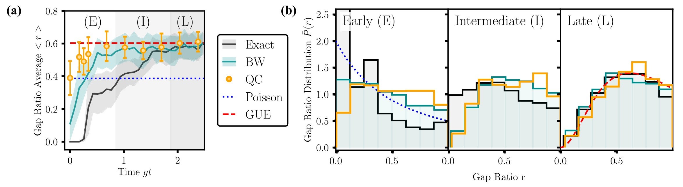 The experimental data successfully showed universal early-time signals for quantum chaos. Specifically, the gap-ratio distribution transitioned from a Poisson distribution, which is characterisitic for unentangled initial states, toward one indicative of quantum chaos and level repulsion, associated with the Gaussian unitary ensemble (GUE) of random matrix theory.