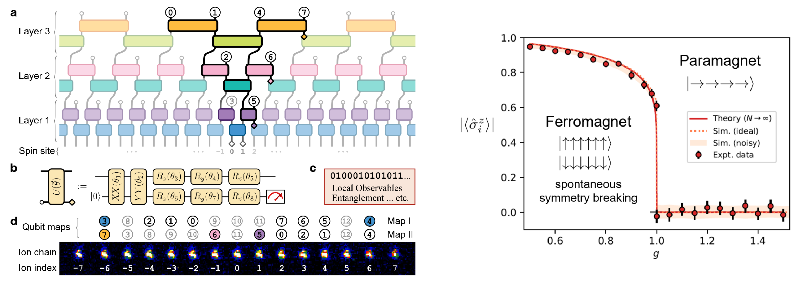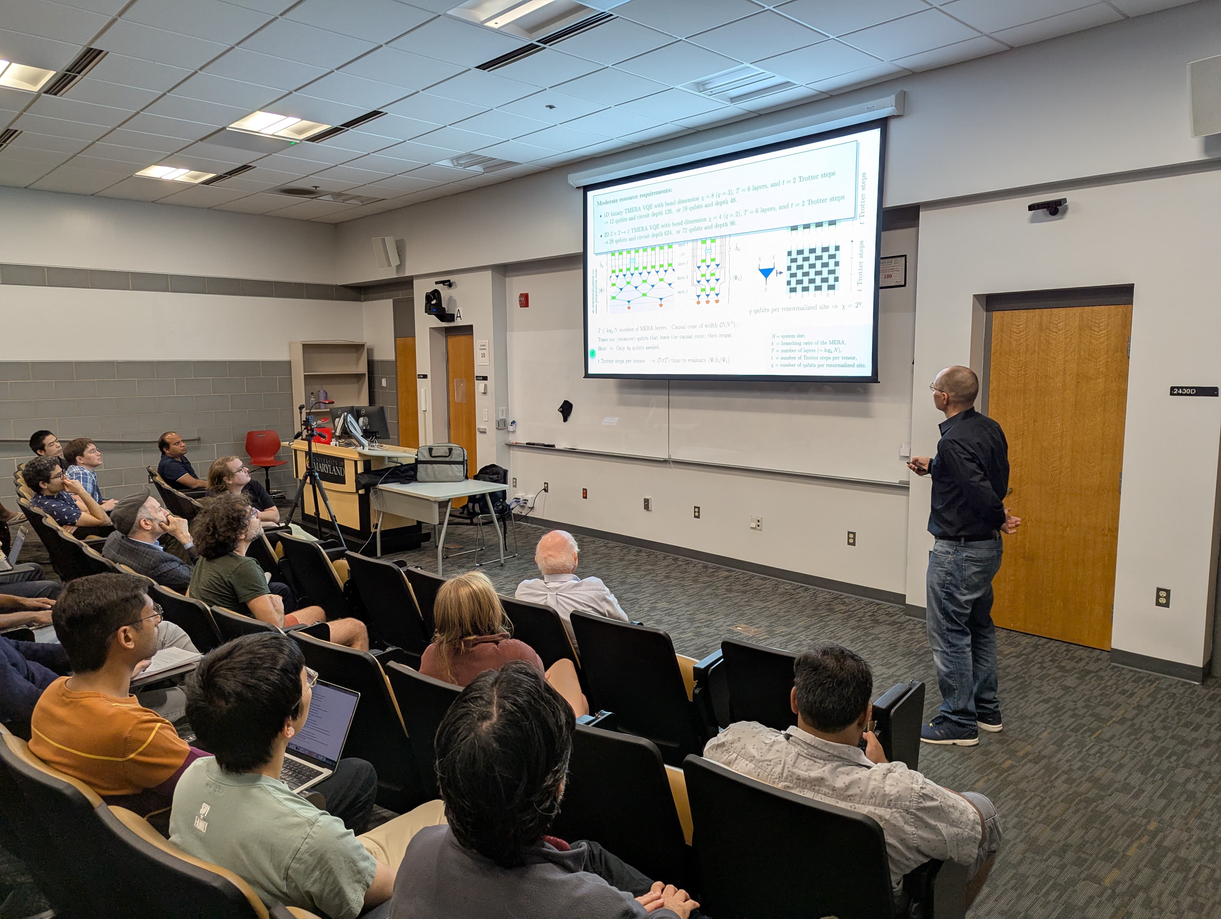 In the JQI seminar, Barthel also described first experimental tests conducted on ion-trap devices in collaboration with Marko Cetina and Ken Brown of the Duke Quantum Center, which clearly demonstrate a continuous quantum phase transition with a sharp onset of the order parameter at the critical point. Using a new holographic tomography scheme, the team was furthermore able to resolve for the first time the transition from area-law to log-area law scaling of groundstate entanglement entropies when approaching criticality [7]. This observation is a significant milestone on the way to the efficient investigation of quantum matter on quantum computers, with the long-term goal of predicting the properties of strongly-correlated systems like high-Tc materials, topologically ordered systems, and lattice QCD.